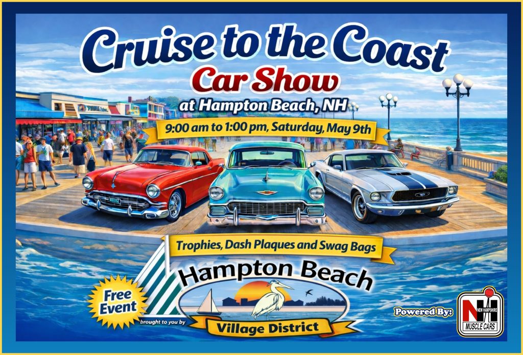 Join us for our inaugural Cruise to the Coast Car Show at Hampton Beach, NH brought to you by the Hampton Beach Village District in collaboration with NH Muscle Cars on May 9, 2026 from 9AM to 1 PM!
